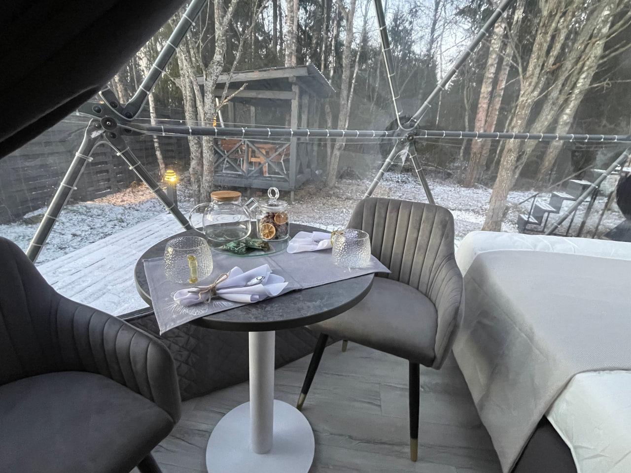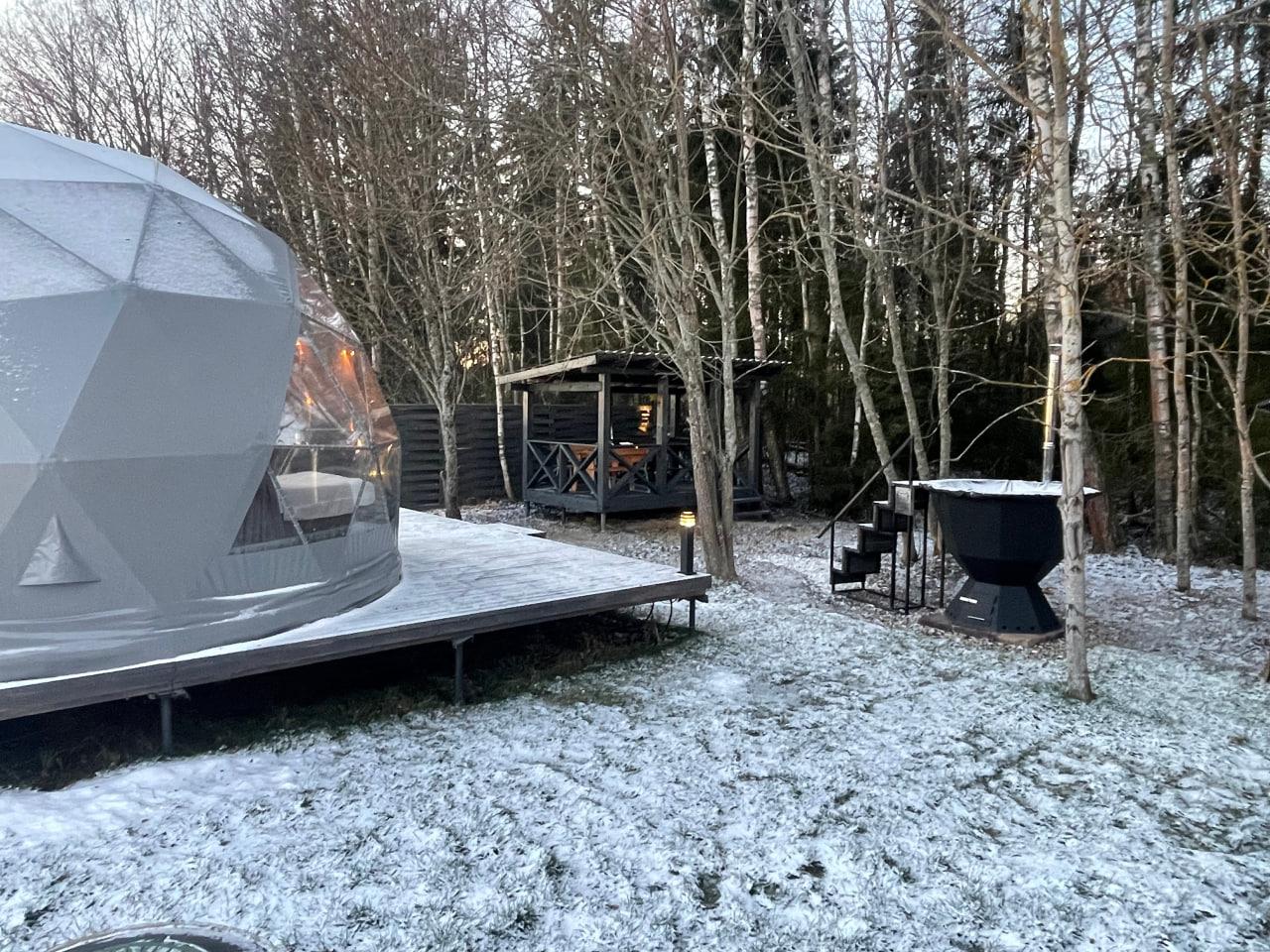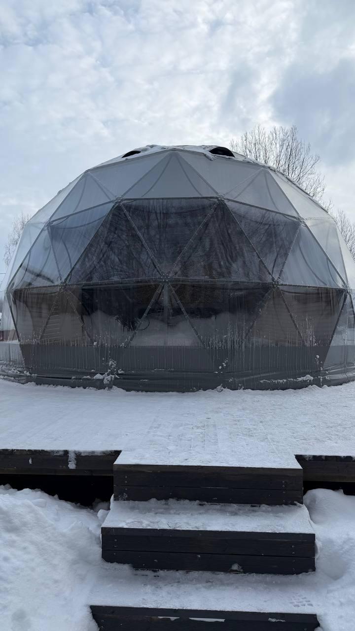 Сфера D-6. Комфортабельная сфера, идеально подходит для проживания 2 взрослых + 1 ребенка, с панорамным видом в лес, диаметром 6 метров и антресольным этажом для сна ваших детей (31 кв.м). Сфера оборудована всем необходимым: Душевая/Туалетная комнат, Кухонная зона с микроволновой печью, холодильником, кофе машиной, чайником, раковиной для мыться посуды. 2 спальных места: Кровать 160х200 на первом этаже и спальное место 140х190 на втором этаже. Стол и стулья для приема пищи, кондиционер. Перед сферой есть терраса 3х6 метров - в летнее время оборудованная зоной отдыха (садовой мебелью): журнальный стол и стулья шезлонги для утреннего кофе пития или завтрака, а также встреч закатов. В сфере есть все необходимое для проживания, гигиенические наборы, тапочки, полотенца, посуда. У сферы стоит беседка с мангальной зоной, в т.ч имеется печь для казана, а также стол с лавочками для посиделок на воздухе. Также у сферы имеется банный чан, который будет подготовлен за 3-4 часа по дополнительной заявке. Банный чан держит тепло до 5 часов. Он может быть нагрет как обычной водой, так и водой с фито добавками. Мята, апельсин, хвоя, можжевельник, роза и тп. Стоимость проживания в сфере D-6: Будни (вне праздничные) – 7 000 руб. /сутки. Беседка и Бассейн, костровая зона (вечером 2 часа после наступления темноты) входит в стоимость. Выходные (вне праздничные) - 11 000 руб. /сут. Банный чан с обычной водой – 3 000 руб., добавки по себестоимости отдельно - цена добавок от 600 руб. до 1 200 руб. на ваш выбор. Праздничные дни - цена устанавливается за неделю в зависимости от загрузки. Уточняйте по телефону.